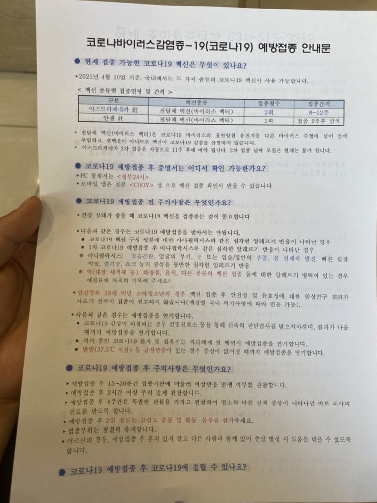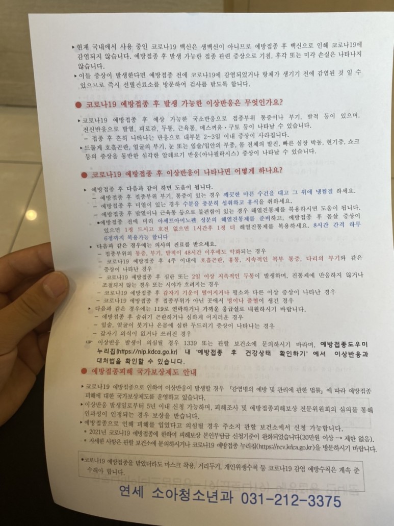 - 접종 후 15분간 대기 및 설명