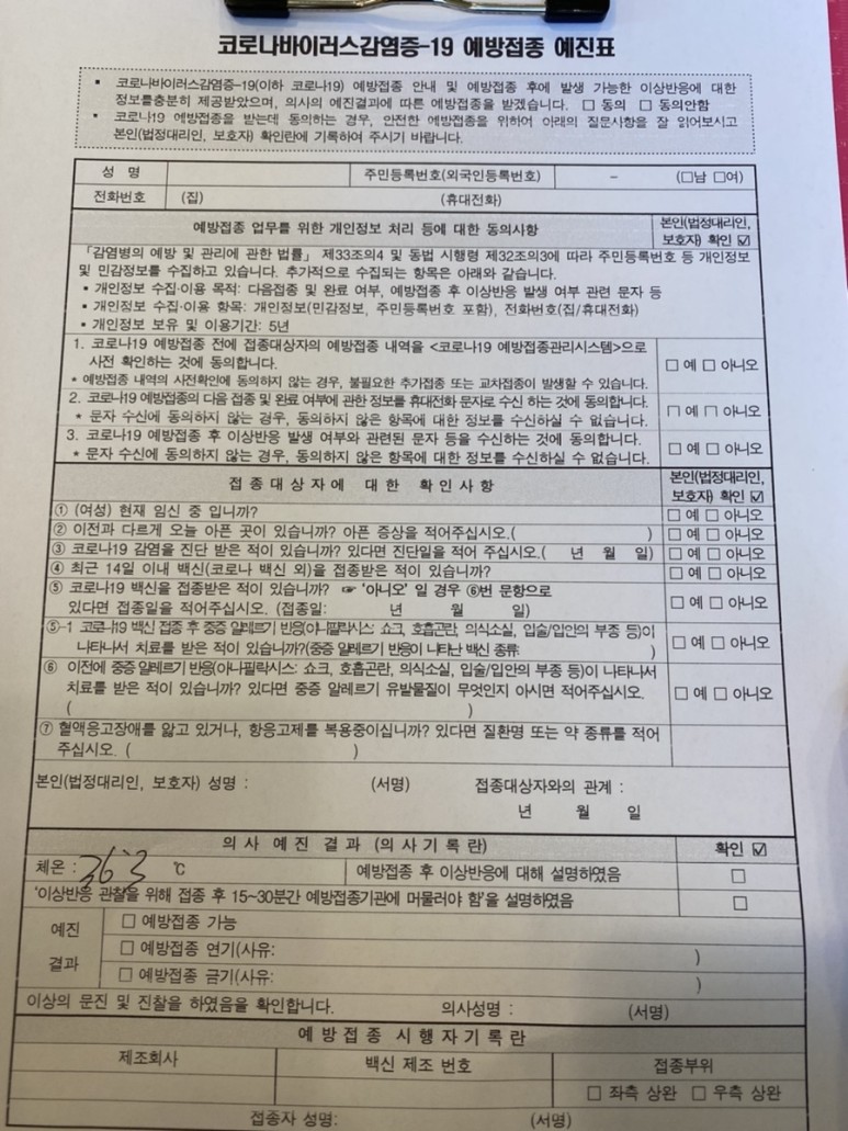 16일 12시 접종이라 병원에 도착해서 설문지 작성 먼저 하였습니다.