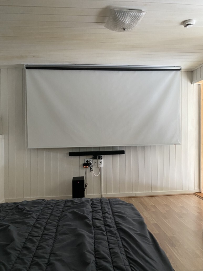 침대 앞에는 빔프로젝트와 테이블이 있습니다.