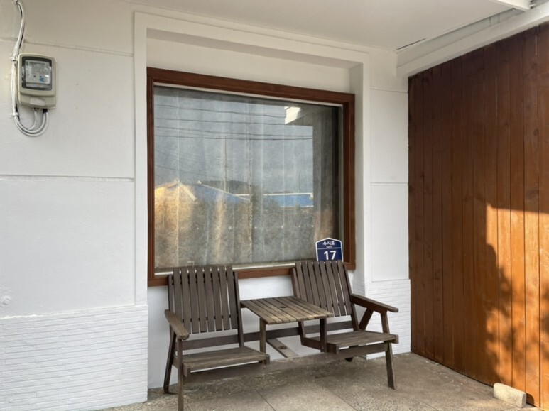 숙소에 들어가면 이렇게 넓은 거실과 큰 창이 있습니다. 창밖으로 보이는 돌담과 나무가 집과 어우러지면서 마음이 편안해진달까ㅎㅎ