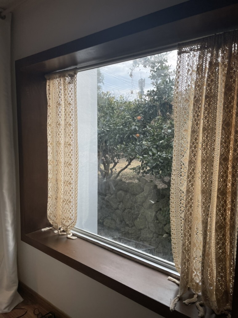 큰 창을 좋아하는데 이 숙소에서 가장 마음에 들었던 부분이 창이었어요. 제주도의 돌담이 창밖으로 보여서 제주도에 온 느낌이 물씬 났답니다.