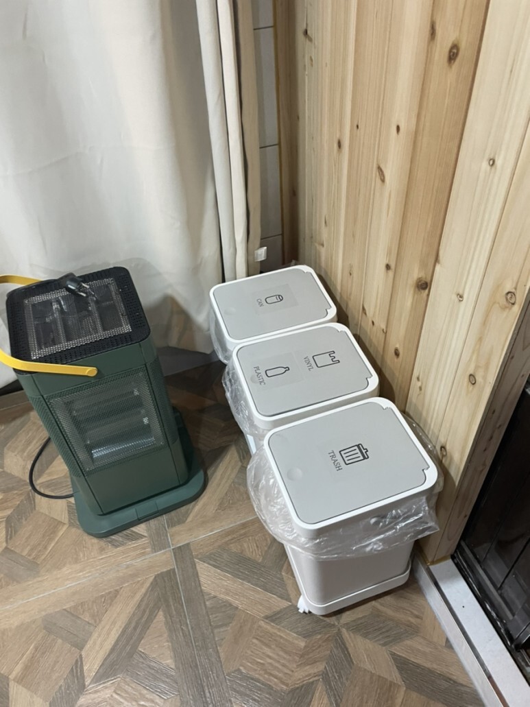 쓰레기통도 분리수거 가능하게 되어 있었고 파우더룸이 추울 수 있어 전기난로도 마련되어 있었습니다.