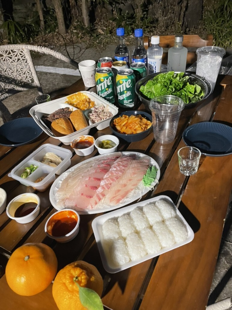 서귀포 올레시장에서 사 온 흑돼지와 회에 한라산 한잔하며 여행을 마무리했답니다.
