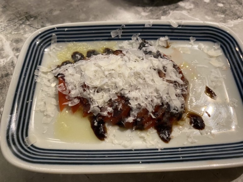 토마토 위에 발사믹, 오일 뿌려져있는 식전 식감 좋은 녀석입니다.
