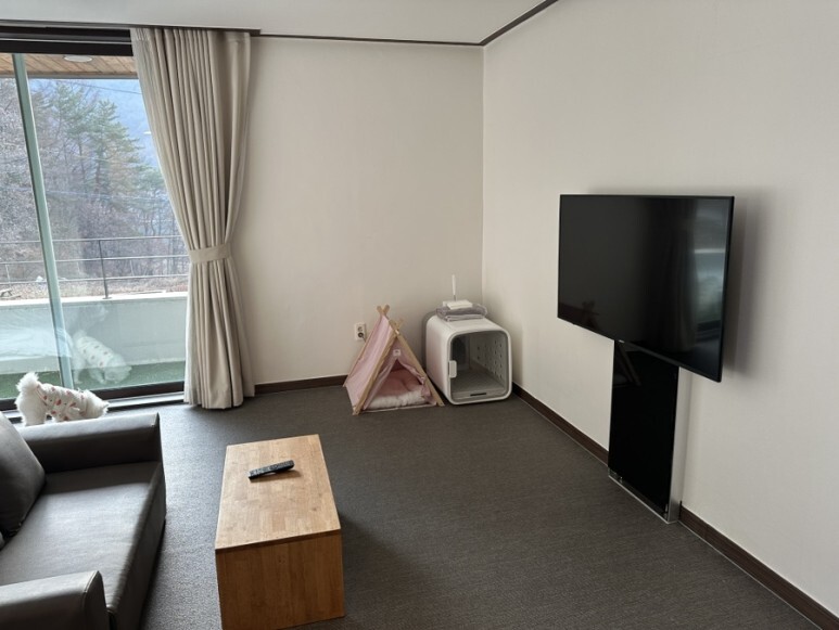 미니 소파, 티비가 있고 통창으로 밖에 훤히 보입니다.