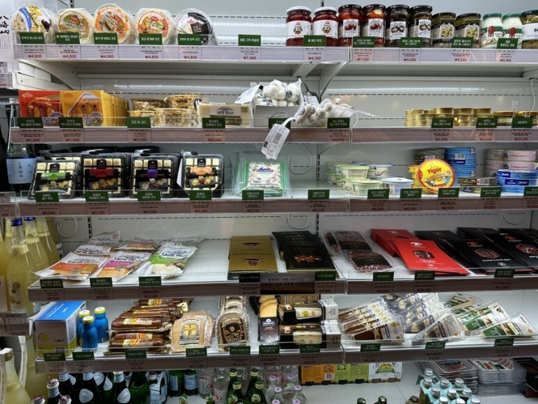 냉장 코너에는 낮은 도수의 사케, 맥주, 막걸리, 치즈, 하몽 초리조 등 잔뜩 있습니다.