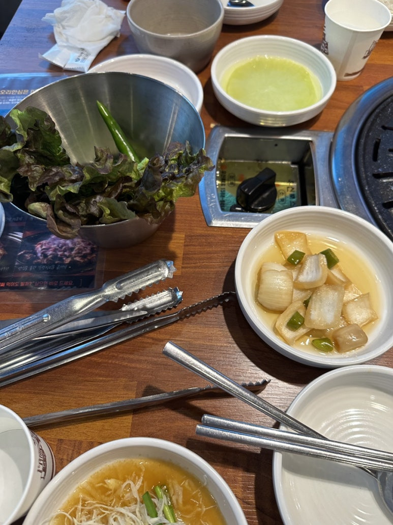 상추, 양파절임, 양배추 절임, 무쌈 등 기본 찬이 나왔습니다.