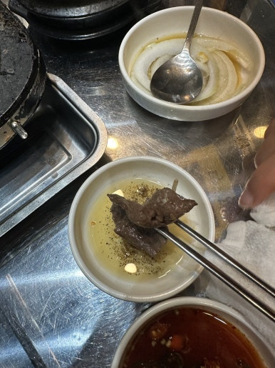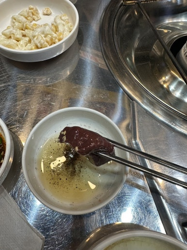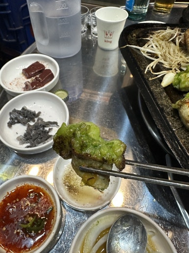 신선할 때만 먹을 수 있는 천엽 그리고 간을 소금장에 찍어서 한입씩 먹었습니다.