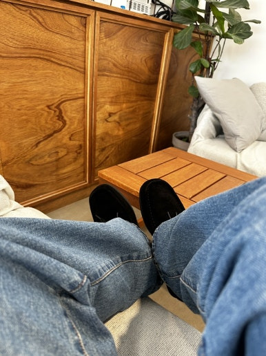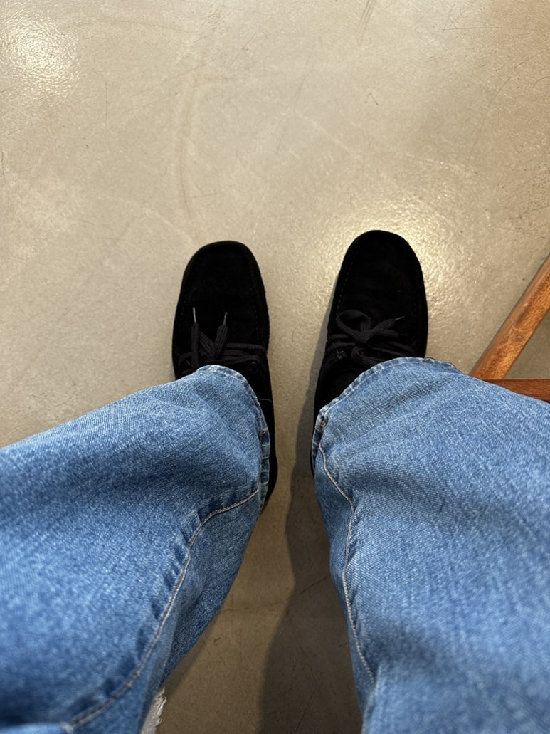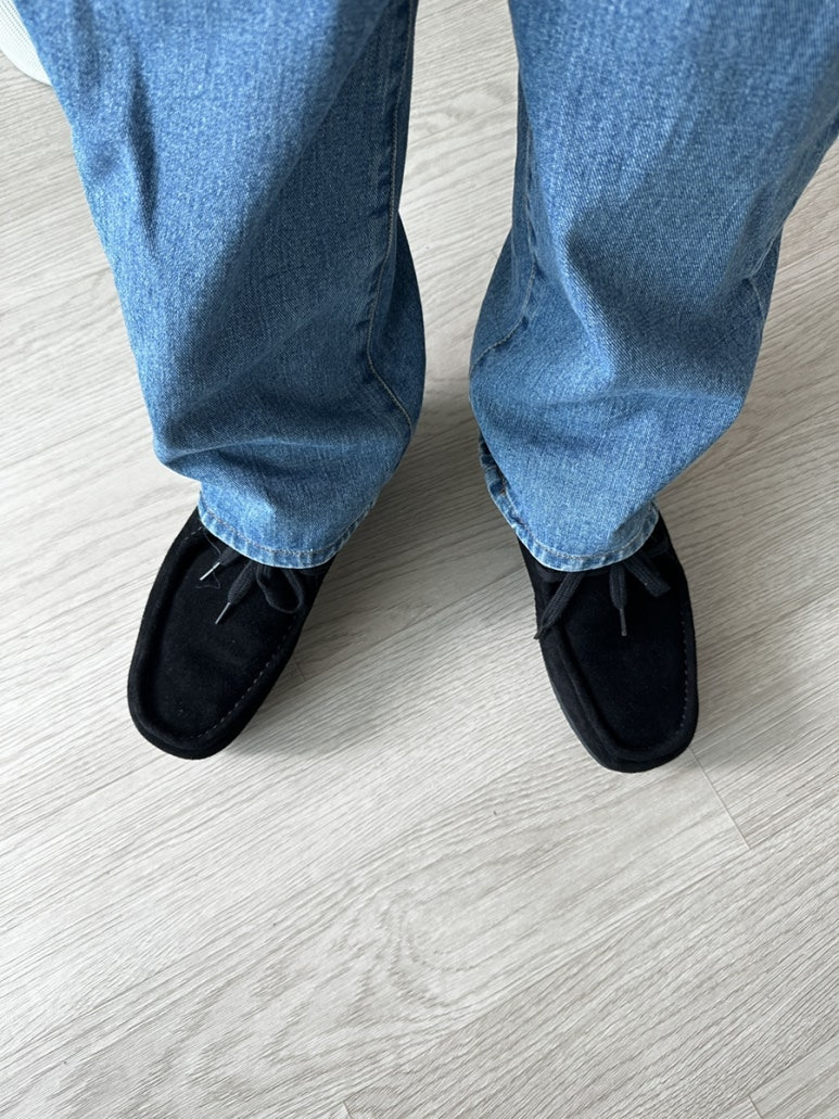 개인적으로 오버핏한 청바지하고 검은색 스웨이드 신발이 잘 어울린다고 생각 들었습니다.
